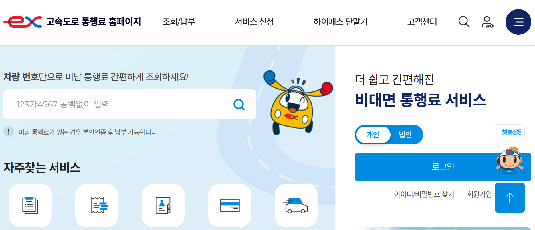 한국도로공사 하이패스 사이트에 접속하여 로그인합니다.